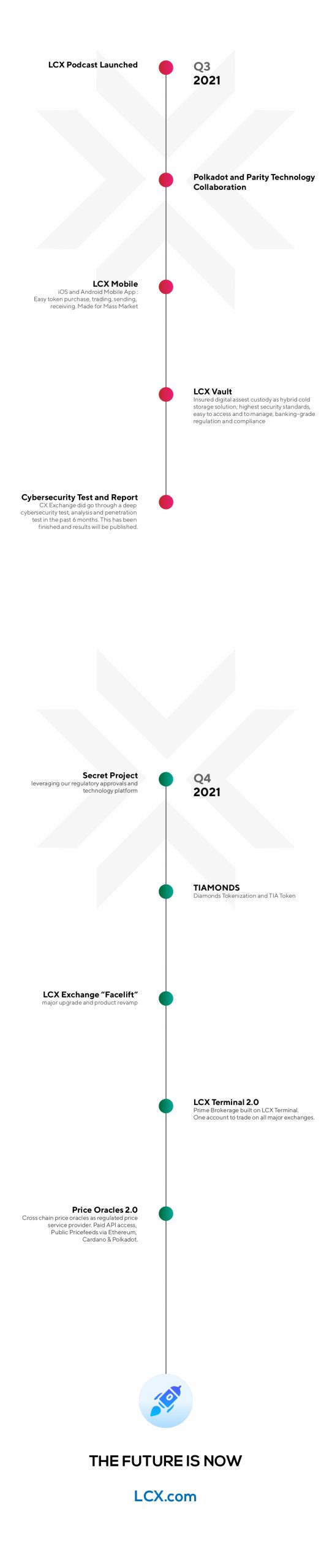 LCX Product Roadmap 2021: LCX Exchange, Liechtenstein Protocol, DeFi 2.0, Price Oracles 2.0, LCX Terminal 2.0, LCX Mobile and more.