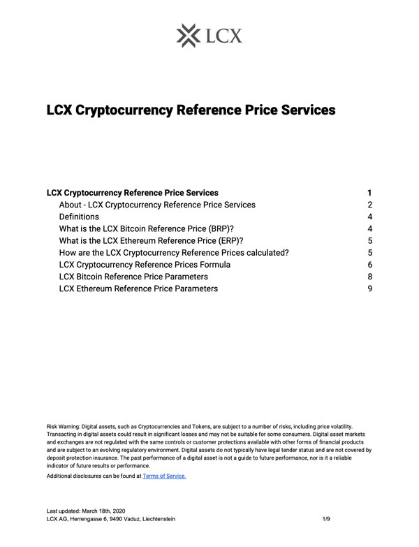 The LCX Cryptocurrency Reference Price Service provides a credible reference price to the marketplace and enhances market participants’ risk management of digital assets. LCX Cryptocurrency Reference Price Services are designed to help accelerate the professionalization of digital asset trading.